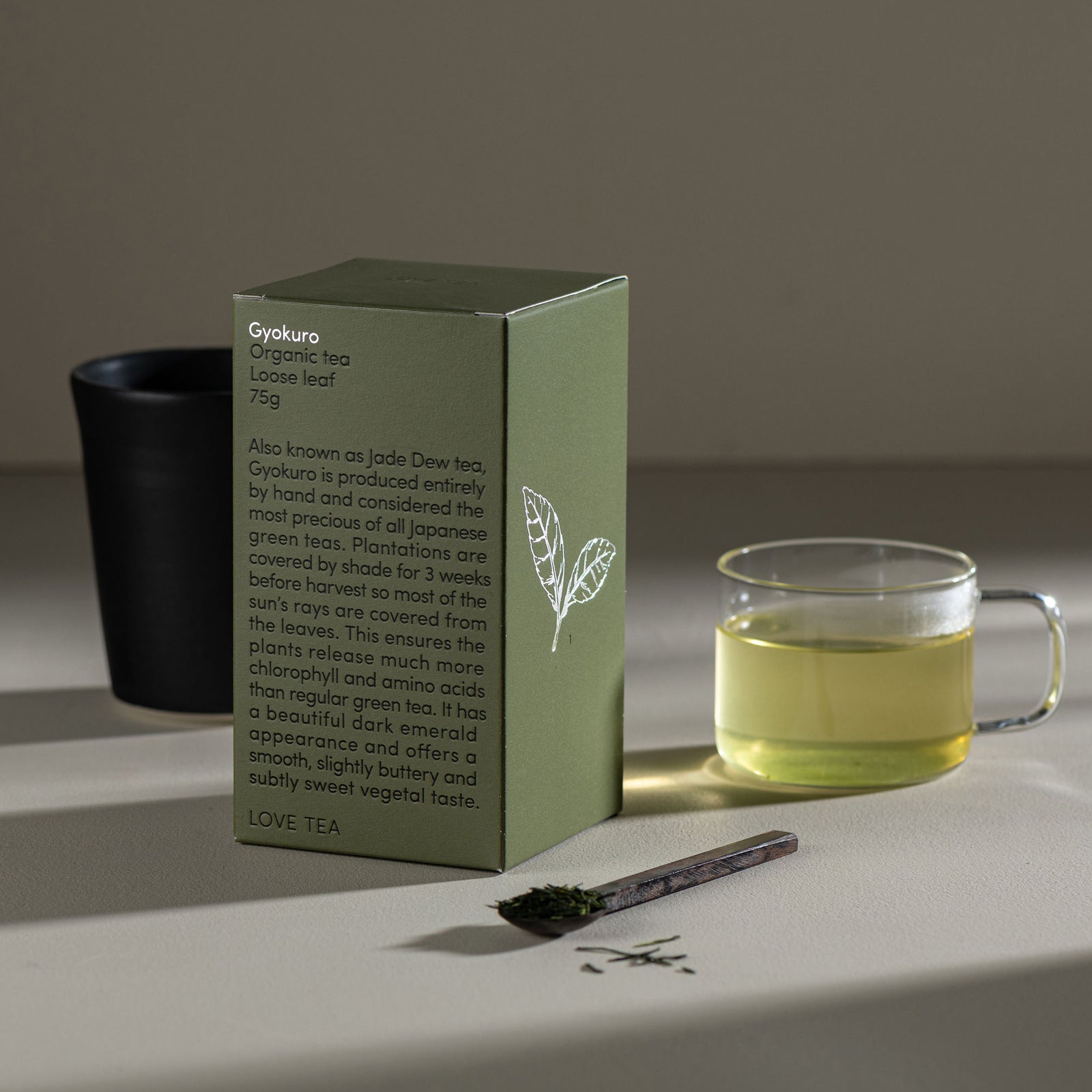 Also known as Jade Dew tea, Gyokuro is produced entirely by hand and considered the most precious of all Japanese green teas. Gyokuro plantations are covered by shade for 3 weeks before harvest so most of the sun’s rays are covered from the leaves. This process ensures the plants release much more chlorophyll and amino acids than regular green tea. Gyokuro has a beautiful dark emerald appearance and offers a smooth, slightly buttery and subtly sweet vegetal taste profile.