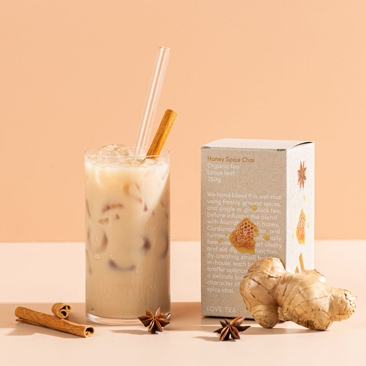 To create an iced chai, steep 2 teaspoons of tea with 50ml of boiling water for 10 minutes, add 1 cup of milk, stir, then allow to chill in the fridge for a minimum of two hours. Stir, then pour through a strainer directly over ice. For larger servings, simply adjust the measurements as required.