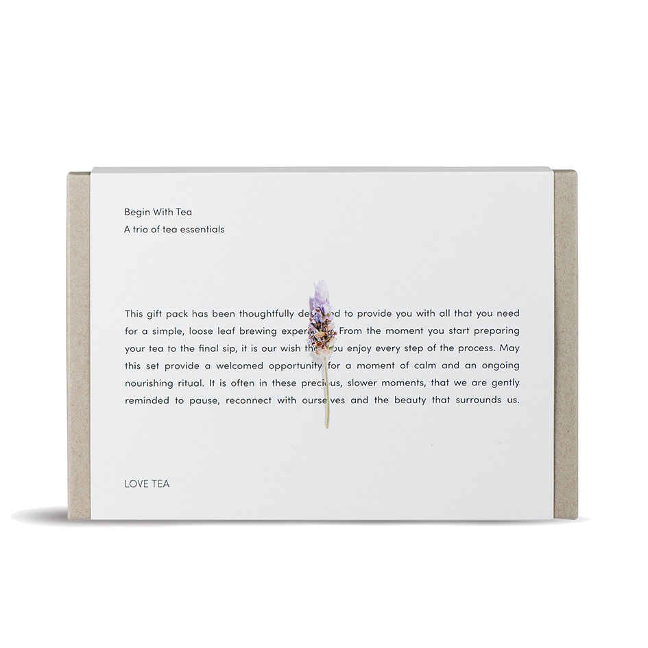 This gift pack has been thoughtfully designed to provide you with all that you need for a simple, loose leaf brewing experience. From the moment you start preparing your tea to the final sip, it is our wish that you enjoy every step of the process. May this set provide a welcomed opportunity for a moment of calm and an ongoing nourishing ritual. It is often in these precious, slower moments, that we are gently reminded to pause, reconnect with ourselves and the beauty that surrounds us.