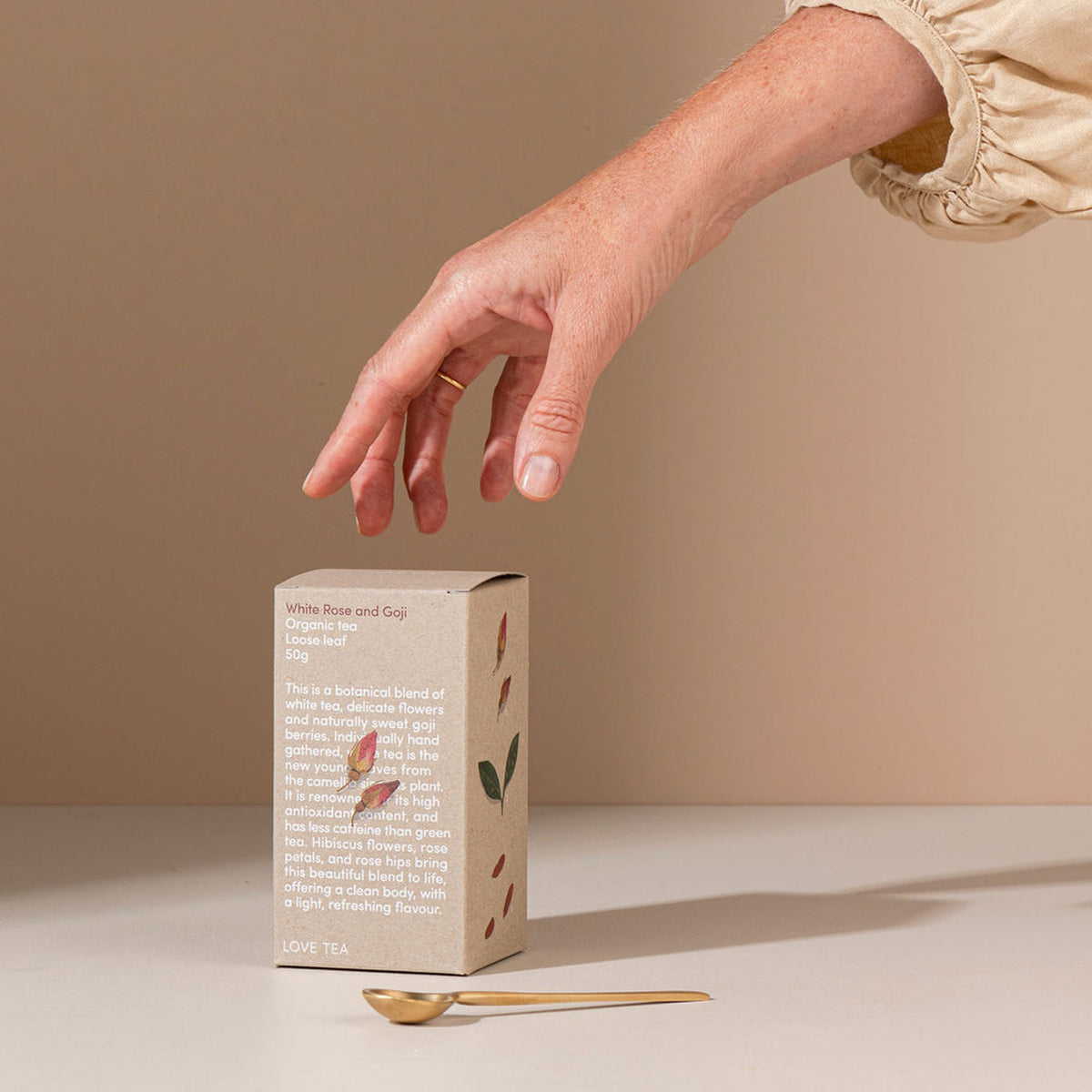 This is a botanical blend of white tea, delicate flowers and naturally sweet goji berries. Individually hand gathered, white tea is the new young leaves from the camellia sinensis plant. It is renowned for its high antioxidant content, and has less caffeine than green tea. Hibiscus flowers, rose petals, and rose hips bring this beautiful blend to life, offering a clean body, with a light, refreshing flavour.