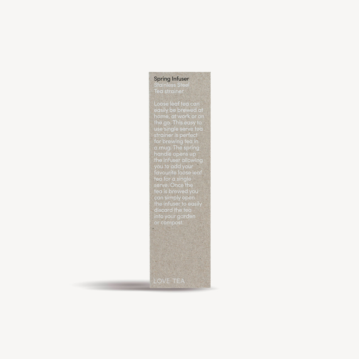 Loose leaf tea can easily be brewed at home, at work or on the go. This easy to use single serve tea strainer is perfect for brewing tea in a mug. The spring handle opens up the infuser allowing you to add your favourite loose leaf tea for a single serve. Once the tea is brewed you can simply open the infuser to easily discard the tea into your garden or compost. This range of Love Tea products also includes a Mug Infuser.